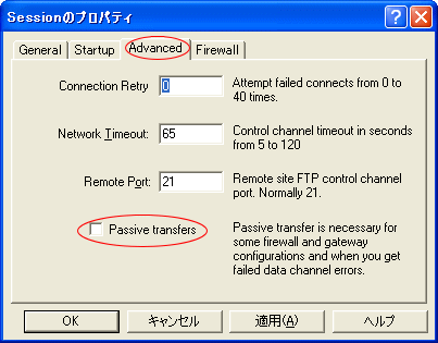 「Advanced」タブをクリックし、「Passive transfers」にチェックが付いている場合は
